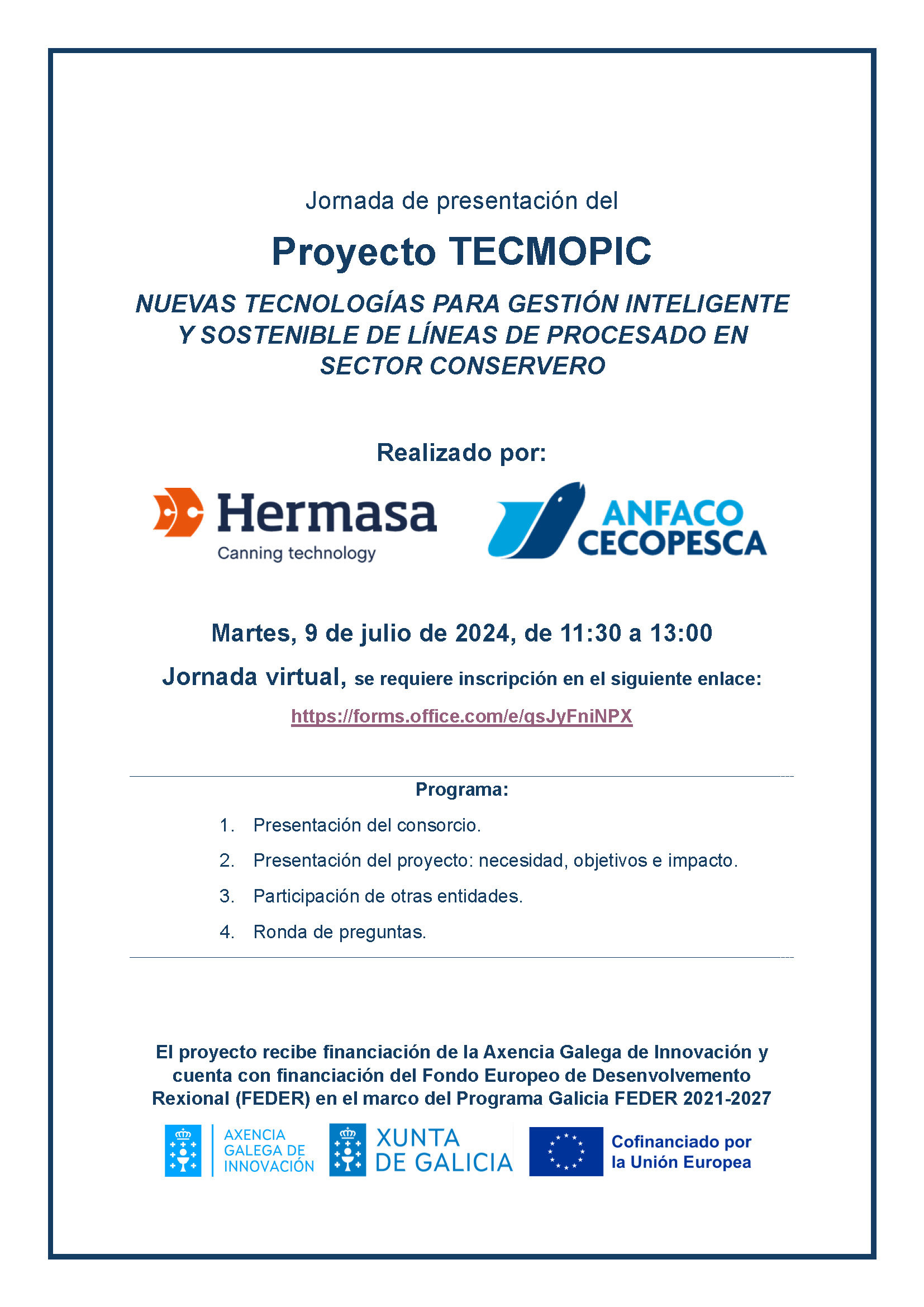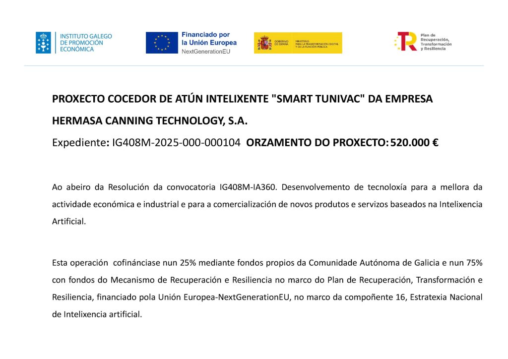 El consorcio formado por las entidades AUTOMATISMOS TEINCO, S.L, HERMASA CANNING TECHNOLOGY, S.A. y TECINGAL NOROESTE, S.L. desarrolla el proyecto titulado: “MELLORATÚN: Aplicación de Tecnologías Emergentes para el Procesado de Túnidos”. Cabe destacar que dicho proyecto cuenta adicionalmente con la subcontratación de los centros tecnológicos ANFACO-CECOPESCA y ENERGYLAB.